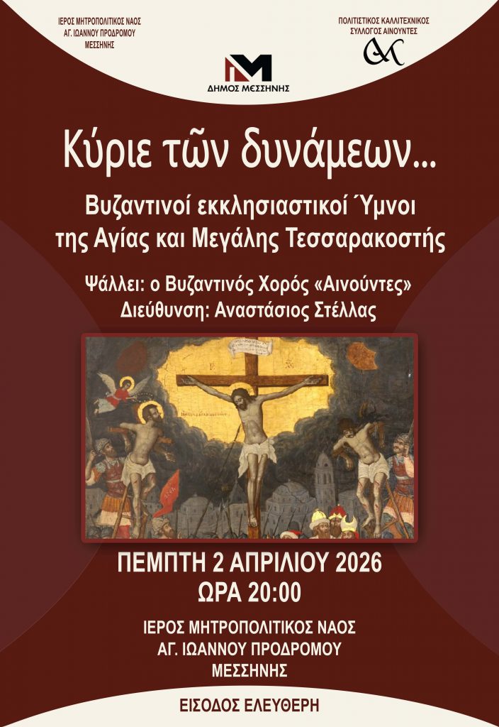 Με ιδιαίτερη επιτυχία πραγματοποιήθηκε την Πέμπτη 2 Απριλίου 2026 η εκδήλωση με τίτλο «Κύριε των Δυνάμεων…», αφιερωμένη στους βυζαντινούς εκκλησιαστικούς ύμνους της Αγίας και Μεγάλης Τεσσαρακοστής. Ο Βυζαντινός Χορός «Αινούντες», υπό τη διεύθυνση του Αναστασίου Στέλλα, απέδωσε με ομοιογένεια, ακρίβεια και βαθιά κατάνυξη τους ύμνους της περιόδου, προσφέροντας στο κοινό μια ξεχωριστή πνευματική εμπειρία.